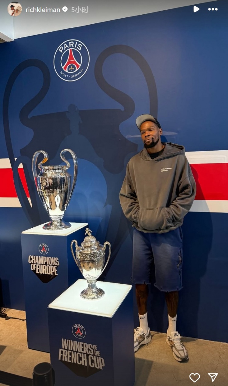 6月15日讯 今天,杜兰特的商业伙伴Rich Kleiman在INS分享了杜兰特和巴特勒的合影,他们出现在洛杉矶的PSG球场。